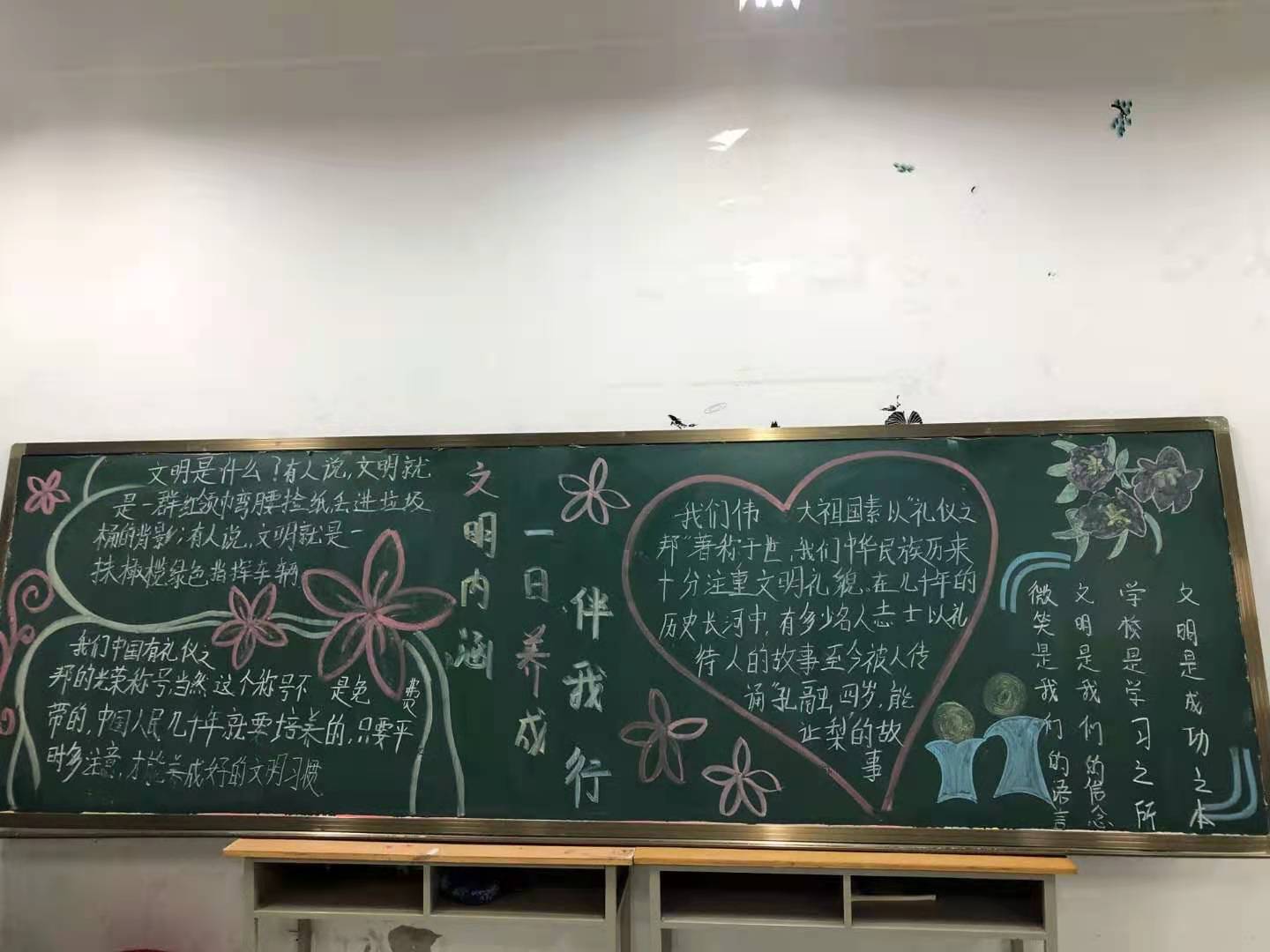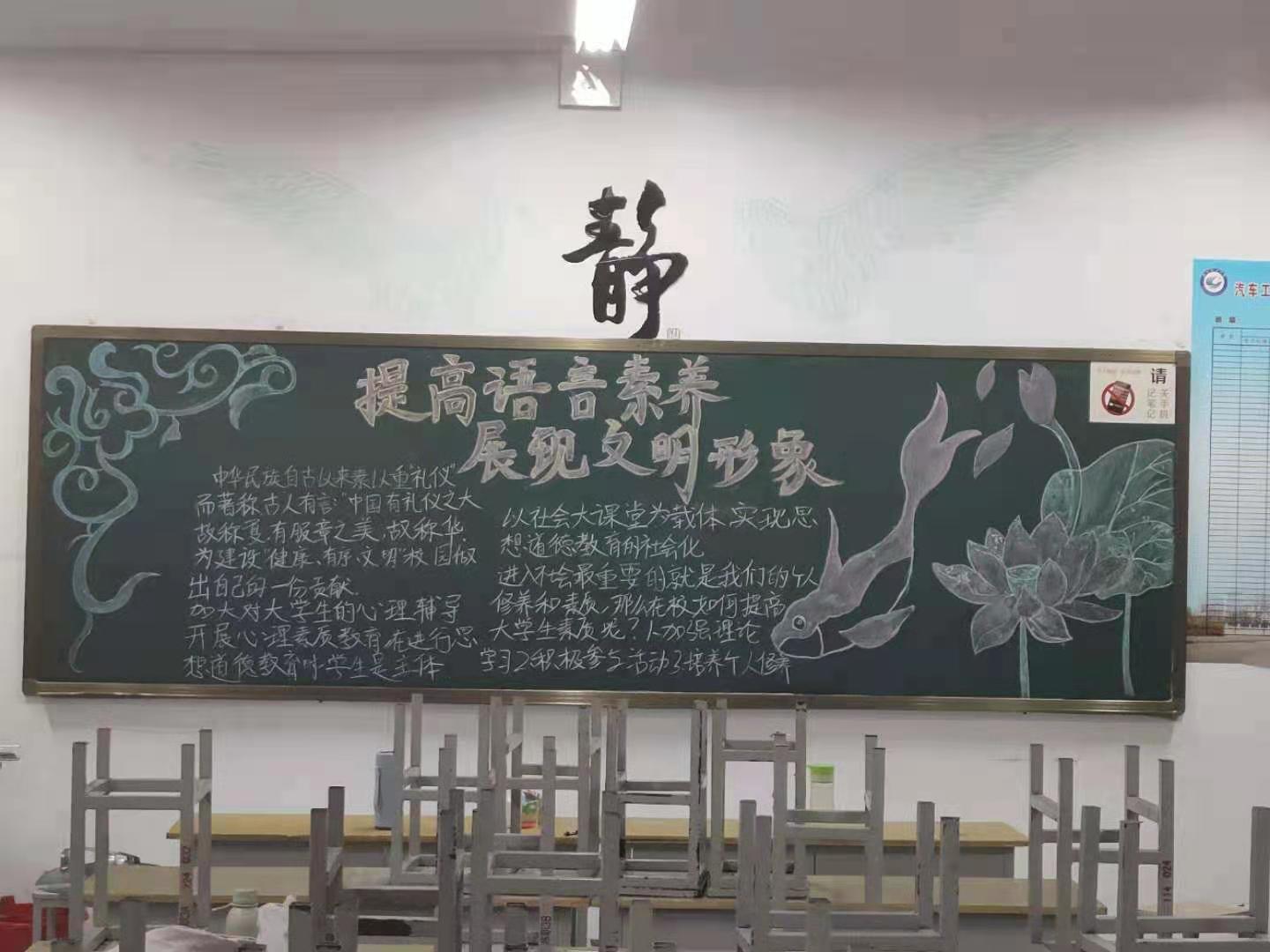 文明礼仪是当代大学生学习和生活的基础,是个人、社会、国家所拥有的巨大隐形财富。汽车工程学院于12月5日举办“文明内涵一日养成伴我行”主题班会及黑板报宣传活动,教育在校生加强自身修养、注重文明礼仪。