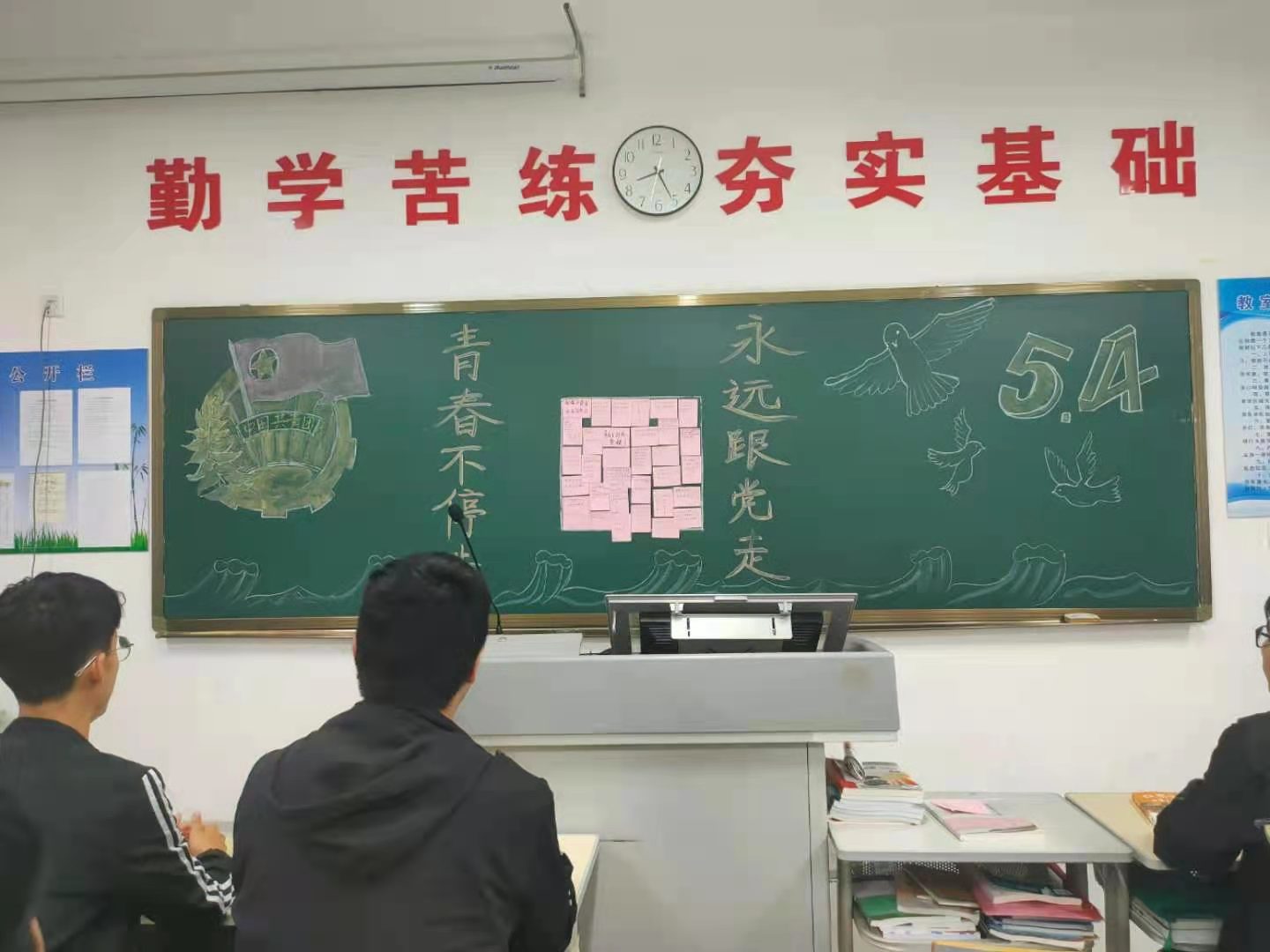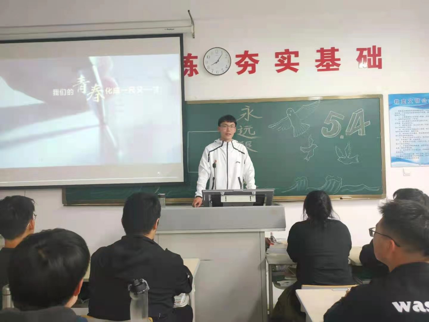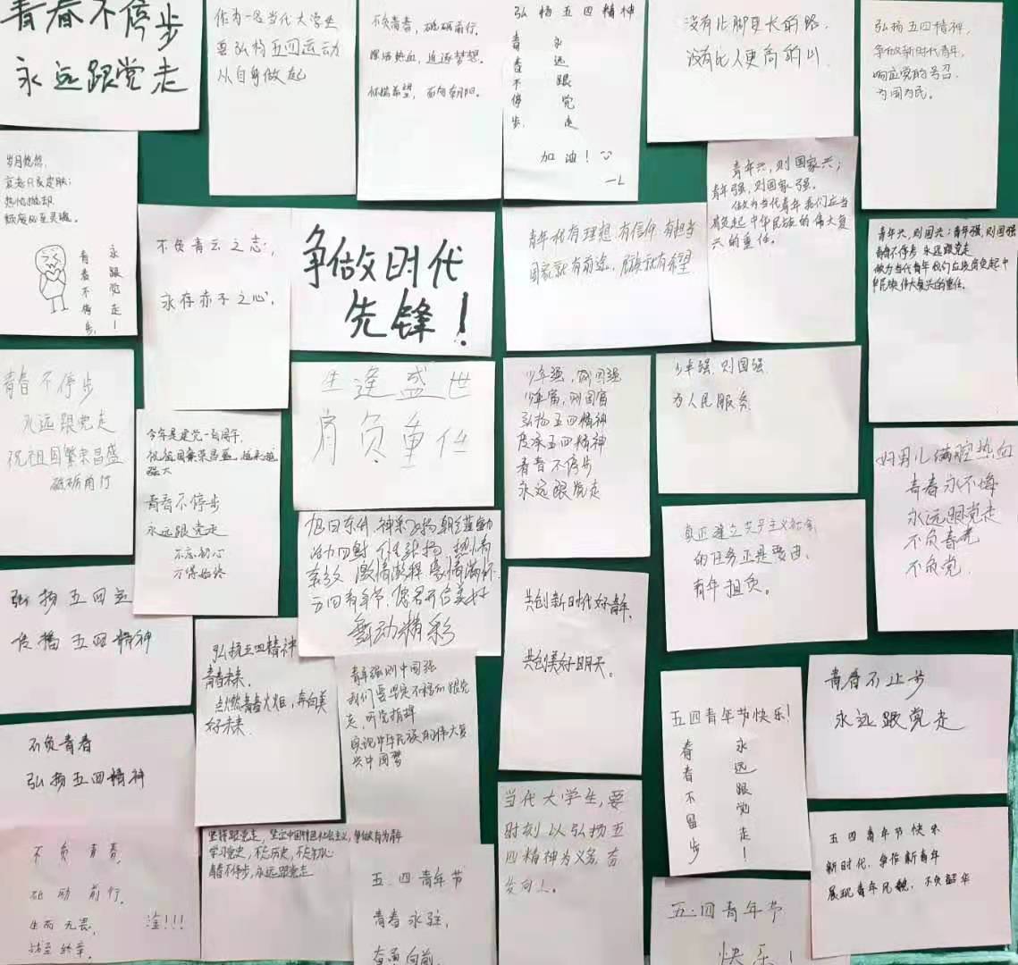 系列活动第一阶段组织开展了“传承五四精神,争做时代青年”主题团课,各团支部书记带领同学们观看回顾五四运动涌现的先进人物及其感人事迹,号召大家向革命前辈学习,弘扬“五四”精神,勇担历史使命。第二阶段组织同学们收看央视五四青年节晚会并撰写观后感,感悟祖国今天的美好和强大,明白美好生活的来之不易,思考如何做作一名合格的新时代青年。第三阶段组织同学们制作五四青年节主题黑板报,用丰沛的情感,真诚的敬意,丰富的想象力来纪念五四运动,弘扬五四精神。最后开展四五青年节寄语展活动,组织同学们把自己对五四运动和五四精神的感悟,做成寄语签,贴在黑板上,表达对祖国美好未来的祝福和期盼,以及坚定理想信念的决心和信心。
