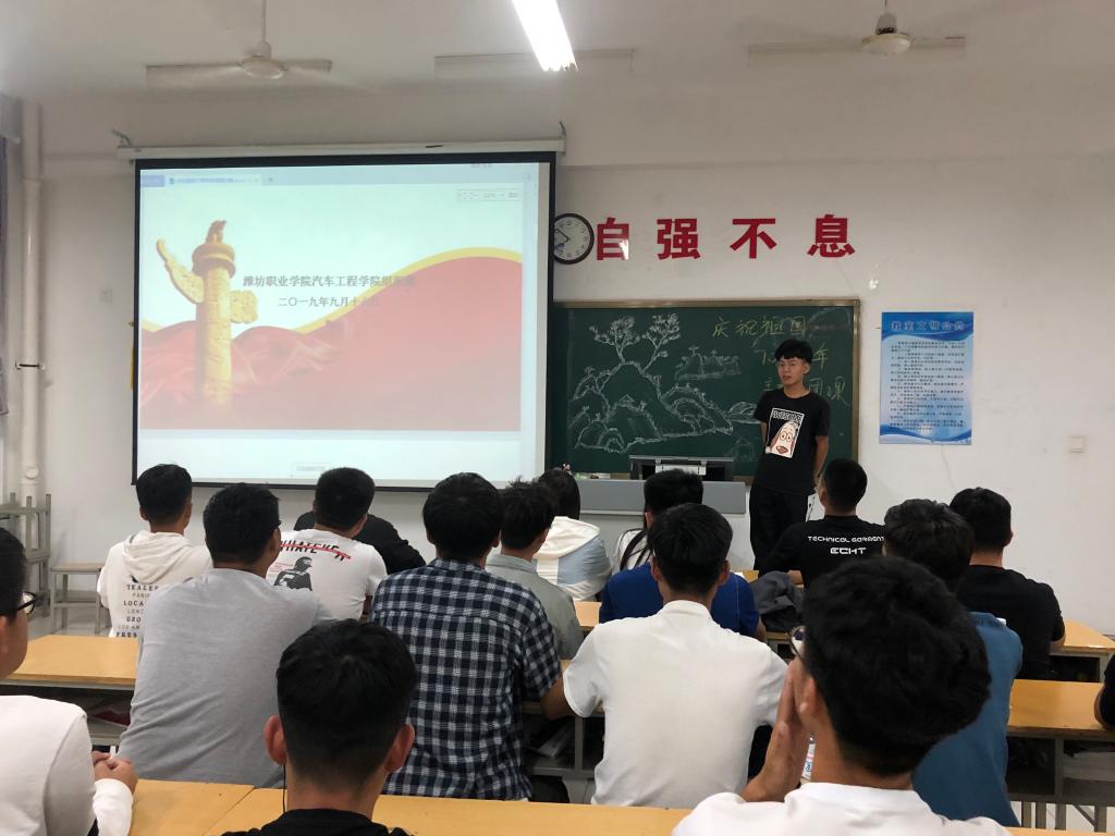 为隆重纪念中华人民共和国成立70周年,讴歌伟大祖国所取得的辉煌成就,按照学院《关于开展庆祝中华人民共和国成立70周年活动的通知》要求,919日晚自习,汽车工程学院各班级在惠泽2号楼B区教室开展了庆祝建国70周年主题团课。