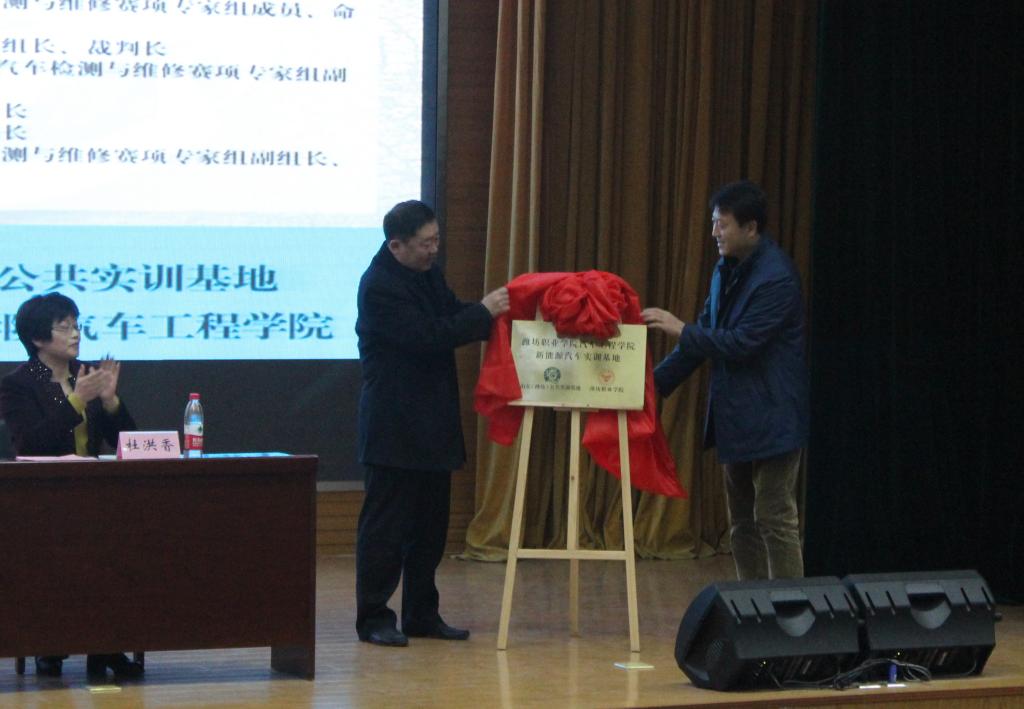 活动伊始,汽车工程学院院长杜洪香及滨海教育投资集团常务副总经理许京波分别发言,回顾了双方以往的合作情况,表达了进一步加强校企合作的迫切愿望,并希望此次活动取得圆满成功。其后,杜洪香院长和许京波副总经理代表双方签署了“共建潍坊职业学院汽车工程学院新能源汽车实训基地合作协议”;学院党委副书记宋桂言和许京波副总经理共同为“潍坊职业学院汽车工程学院新能源汽车实训基地”揭牌。随后,中国汽车工程学会技术副总监弋国鹏作了“新能源汽车与职业教育”的专题报告。报告深入浅出,加深了师生对新能源汽车的认识,开拓了视野。