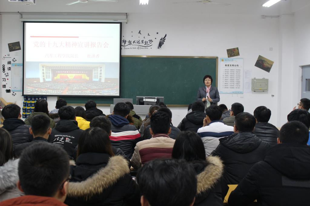 汽车工程学院院长杜洪香在2016级汽车新能源技术班的宣讲中,阐明了高举中国特色社会主义伟大旗帜,决胜全面建成小康社会的伟大蓝图,给学生讲解了十九大主题、习近平新时代中国特色社会主义思想的历史地位和丰富内涵、我国社会主要矛盾的变化三个主题,号召学生在党的十九大精神指引下,努力学习,奋发有为,为实现中华民族伟大复兴的中国梦奉献自己的一份力量。