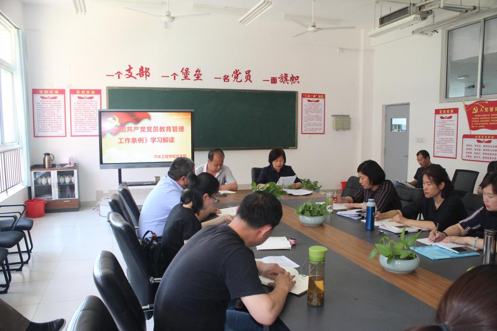 为充分激发党组织的生机活力,建设一支信念坚定,政治可靠,纪律严明,作风优良的党员队伍,5月23日下午,汽车工程学院党支部召开支部扩大会议,在党员活动室集中学习了《中国共产党党员教育管理工作条例》。汽车工程学院院长杜洪香同志带领全体教师进行学习。