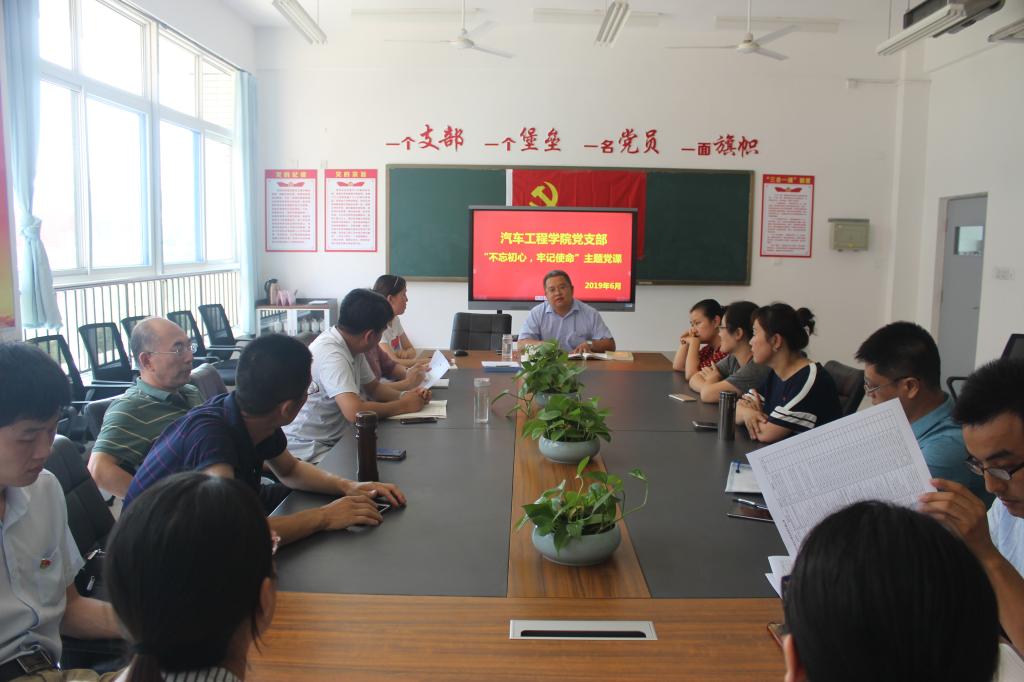 6月27日下午,支部首先举行了重温入党誓词活动,在汽车工程学院院长杜洪香同志的带领下,全体党员面向党旗,庄严宣誓,对党忠诚,为共产主义奋斗终生。随后支部委员张勇同志讲授了以“不忘初心、牢记使命”为主题党课,张勇同志首先传达了习近平总书记在“不忘初心、牢记使命”主题教育工作会议上的讲话精神,随后他从为什么要开展主题教育;怎样把握12字“总要求”;把握5个“重点”,明确定出目标任务;阐明方法步骤,真抓实干转变作风等几个方面进行详细讲解,引导党员教师立足本职工作,践行党的宗旨,在学院“双创”工作中干事创业、担当作为、勇于奉献,积极发挥先锋模范作用。