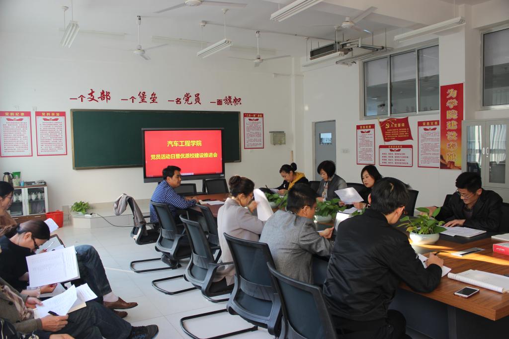为落实学院暑期读书班会议精神,进一步加快我院德促项目落实落地,10月30日下午,汽车工程学院在党员活动室开展党日活动,暨优质校建设项目推进会。会议由汽车工程学院院长杜洪香主持,无课党员教师以及德促项目各实训室建设负责人参加了会议。