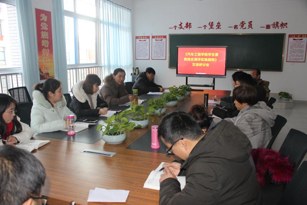 研讨会由汽车工程学院分管负责同志主持,他首先指出了学生素质综合测评中出现的一些问题,阐述了制定学生素质综合测评实施细则的意义、目的和现实需要。团总支负责人讲解了实施细则制定的目的和根据,综合测评体系中各计分点的设置原则,以及如何利用测评体系提高学生综合素质的养成和学生管理的精细化,并对各指标如何使用展开了详细的讲解。汽车工程学院辅导员和班主任纷纷发言,对实施细则提出了自己许多想法。最后党支部负责同志强调要将大学生素质综合测评工作落到实处,充分发挥综合测评的引导性和规范性,通过测评对学生做出全面客观的评价,调动学生参加各项活动的积极性,有效促进学生综合素质的全面提高。