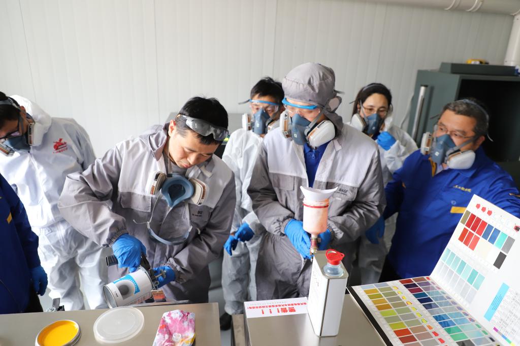 此次培训内容主要包括喷涂工具与设备操作方法、喷枪调整和性能测试;涂料调配及使用,油漆辅料的选择和使用;油漆调色的基础理论,颜色工具的使用;烤漆工艺及流程;成果展示、反馈总结等内容。培训中,培训教师干练精辟、细致入微的宣讲使得学员们激情高涨,并设置了一些课堂游戏,课堂氛围极好。教师学员们认真听取基本理论和实操要领,不时询问;实操环节更是争先恐后,严肃认真,谨慎地按照培训教师要求进行操作,精准调制油漆配比,仔细进行样板喷涂,积极参与培训。为提高培训质量,此次培训特别设置了测试考核和成果展示环节,要求参训教师能独立完成工作流程,自制作品1-2件。